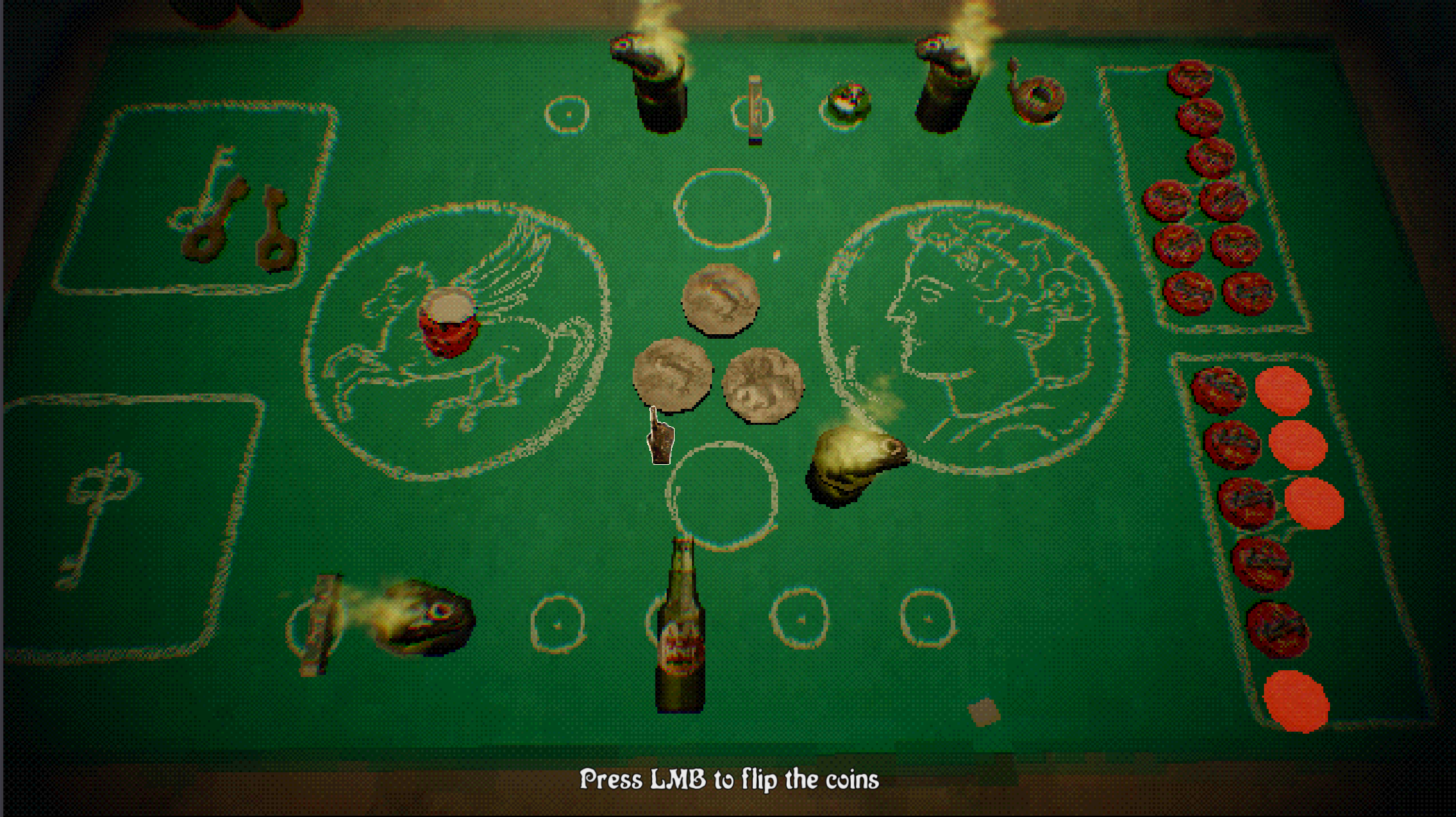 Play a high stake game of head or tails against a mysterious opponent, in a Lovecraftian horror themed environment.